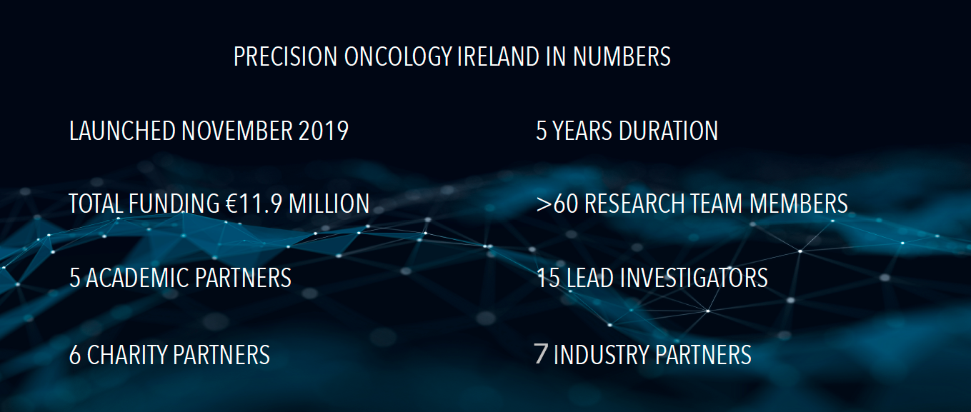 Precision Oncology Ireland (POI) is a consortium of 5 Irish Universities, 6 Irish Charities, and 7 industry partners working to develop new diagnostics and therapeutics for personalised cancer treatment. Officially launched in November 2019, the consortium is part-funded by Taighde Éireann – Research Ireland under their Strategic Partnership Programme, and is co-ordinated by Systems Biology Ireland.
