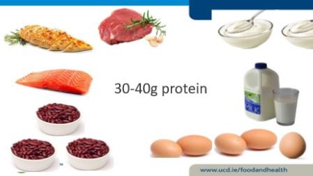 Figure 2: What 30-40g of protein looks like in food. It is equivalent to ~ ¾ L skimmed milk, 5 boiled eggs, ¾ chicken breast or ~ 3-4 oz of cooked mince.