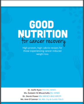 The main goal of cancer nutrition is improvement or indeed maintenance of nutritional status, with a particular focus on maintaining lean mass9. Lean mass refers to body weight excluding fat mass (concentrated in adipose tissue), wherein skeletal muscle mass is a large component. This will reduce treatment associated side effects, aid post-surgery recovery and improve patient’s QOL. Cancer patients are one of the most malnourished group in the hospital setting8. Many patients have nutrition ‘barriers’ that prevent them from eating normally such as anorexia, nausea, vomiting and difficulties in swallowing2. Cancers of the digestive tract cause the most severe weight loss, while some like breast cancer can cause weight gain or no changes in weight at all2. Work conducted by Dr Oonagh Griffin in St Vincent’s University Hospital Dublin demonstrated that unintentional weight loss and resultant malnutrition can be easily missed in patients who were obese prior to diagnosis10. When creating a nutrition plan for these patients, it is important to take their individual symptoms, cancer type and personal tastes into account. For those with difficulty swallowing, softer foods and things like soup which are easy to swallow are key for getting in calories and nutrients. Resources recommend eating smaller more frequent meals rather than 3 large meals which can lead to people feeling full quickly. A patient centred cookbook created by Dr Aoife Ryan and Eadaoin Ni Bhuachalla called ‘(opens in a new window)Good nutrition for cancer recovery’ is an amazing resource full of high protein, calorie rich recipe ideas (Figure 1). It also includes advice for patients at the beginning of the cookbook for each barrier they may face, for example ‘Avoid greasy, spicy and sugary foods with strong odours’ for those with nausea and vomiting11.