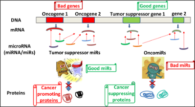 MicroRNAs may function as either oncogenes or tumour suppressors under certain conditions. ‘Oncogenic miRNAs’, are upregulated in cells and they tend to inhibit the expression of potential tumour suppressive genes, while ‘tumour suppressive miRNAs’ are down-regulated causing the augmentation of downstream signal pathways or oncogenes responsible for the development of tumours. OncomiRs and tumour suppressor miRs may target the same or different mRNAs intracellularly (tissue) or extracellularly (in circulation). Different cancers may share common aberrant miRNAs, although cancer-specific miRNAs are the major population.