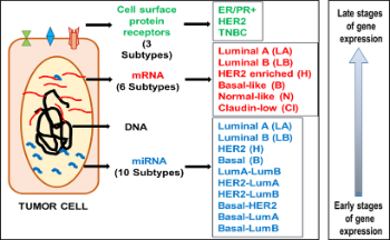Breast cancer has been categorized into various subtypes and treatment decisions have been made based on the surface expression of hormone receptor proteins oestrogen receptor (ER), progesterone receptor (PR), and human epidermal growth factor (HER2). Post-treatment and over a period of disease-free survival, several cases report the emergence of resistant cancer cells of a different subtype or receptor phenotype. This receptor discordance is attributed to the sudden loss of gain of receptor expression mediated by regulation of the receptor gene expression. MicroRNAs can modify the expression of genes post-transcriptionally and lead to the development of intratumoural heterogeneity.