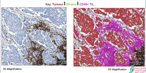 Figure 3. An example of one, trained digital pathology classifier to show location, number, percentage, and density of infiltrating immune cells. Imagine city architecture in red, roads in green, and our coveted HGVs in magenta. Tumour has been stained with CD45 (brown), counterstained with haematoxylin (blue). TIL = tumour infiltrating lymphocyte.