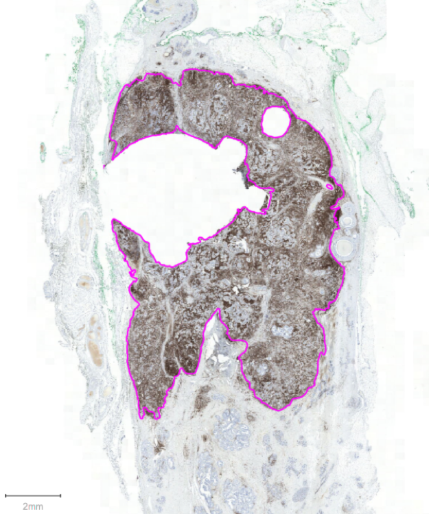 Figure 1. An example of a patient's breast cancer. Purple annotations show the border between invasive and non-invasive tumour area. The high volume of brown staining is indicative of large immune traffic through this tumour. Stained with CD45 (DAB, brown), counterstained with haematoxylin.