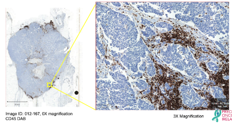 Figure 2. An example high-resolution image of ER+ Breast Cancer stained with the pan-immune marker CD45 (brown), counterstained with haematoxylin (blue). Excerpt shows a magnified region of the tumour at 3X magnification.
