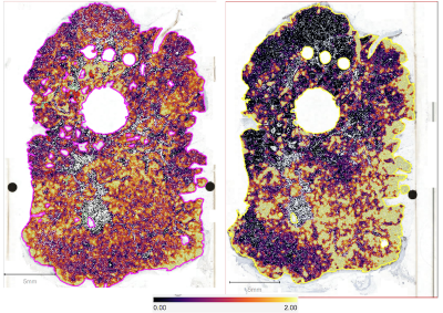 Figure 4. A heatmap of positive markers within two sections of breast cancer from the same patient. Marker density is shown by the key. The left image shows Ki67+ tumour cells - a marker of which tumour cells are actively growing. The right image shows CD45+, a marker of overall immune cells and their ‘neighbourhood’ clustering within the ‘city’ of this tumour.