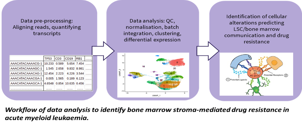 Here, we aim to tackle this unmet clinical need via a novel approach: understanding how the tumour microenvironment interacts and protects the malignant cells that initiate the disease, i.e. the leukemia stem cells (LSC). In this project, we are working towards identifying the genetic determinants LSC subpopulations that drive drug resistance and relapse, and computationally model how the BMM and LSC interaction underpin leukemogenesis, drug resistance and relapse after treatment.