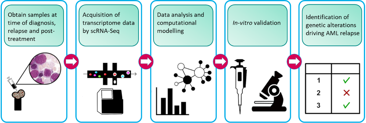 Our research project aims to understand what makes leukemic cells drug-resistant. By understanding how drug resistance occurs, we can develop strategies to prevent this from happening, improve the treatment, and prevent relapse. In order to do this, we are analysing individual cells from patients at various stages of their disease. We look at their cells when they are first diagnosed after they have had treatment, and then when the disease comes back. This approach allows us to identify sub-groups of AML cells in patients and find out which cells are sensitive to drugs and which ones are resistant.